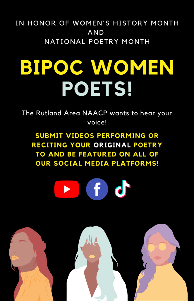 In honor of Women’s History and National Poetry Months, the Rutland Area NAACP is celebrating the remarkable work of BIWOC (Black, Indigenous, and Women of Color) poets. In addition to sharing the performances of established poets, we are seeking videos of Vermont’s BIWOC poets performing their original work!