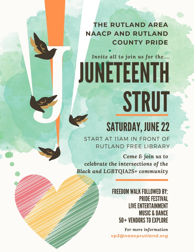 June 22 • Strut at 11am, Pride and Juneteenth celebration 11-5 • Rutland Free Library and Downtown Rutland • More info