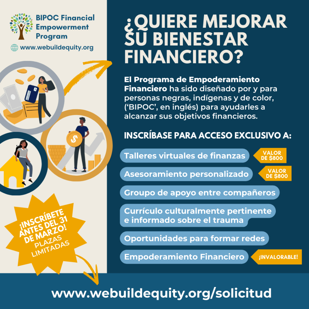 We’re excited to announce the launch of the BIPOC Financial Empowerment Program, an initiative of the Building Equity Collaborative. The program is designed to provide Black, Indigenous, People of Color (BIPOC) with the knowledge, tools, resources and coaching to support their financial wellbeing. BIPOC must be living in Vermont to participate in the program. The program offers exclusive access to virtual workshops on various financial topics, a supportive affinity group setting and 1:1 coaching to help you achieve your goals. The workshops and 1:1 coaching have a combined value of $1,600, however we are offering this at no cost to the BIPOC community. Space is limited however, so apply today to claim your spot! Application closes on March 31st, with workshops beginning in April and ending in October. The program is offered in English and Spanish. Check out the images attached and visit www.webuildequity.org to learn more and sign up.
