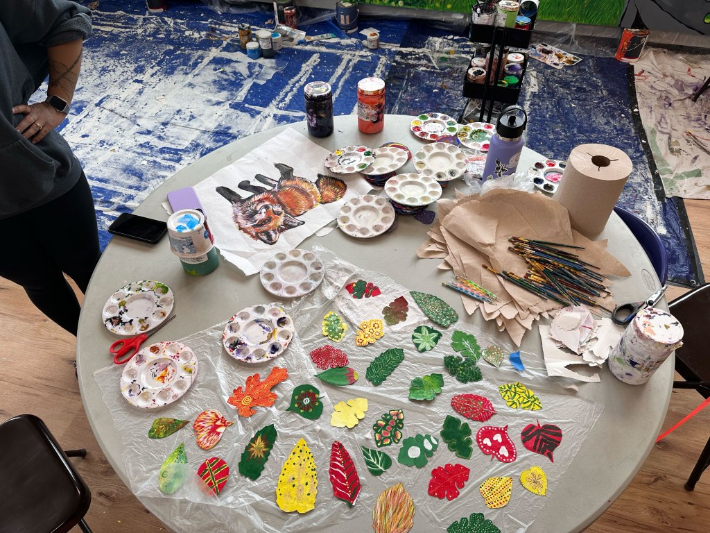 After months of work, the artists of Juniper Creative Arts and students and educators from Manchester Elementary/Middle School will unveil the school’s new mural on Monday, June 9, 2025, from 1:30–2:30 PM. The final piece is in three parts, painted on 75 feet of plywood panels, in the form of a children’s book with an original story concept. This project has been a collaboration between the artists and the students of the MEMS Love, Inclusion and Trust group, who helped shape the concept with their input. It kicked off in March with a concept brainstorm session followed by the Juniper Creative team working with all of the art classes, in addition to facilitating two community painting sessions, in which students and community members painted hundreds of canvas “rocks” and “leaves” that have been collaged into the mural in different scenes as they relate to the building of a community garden.