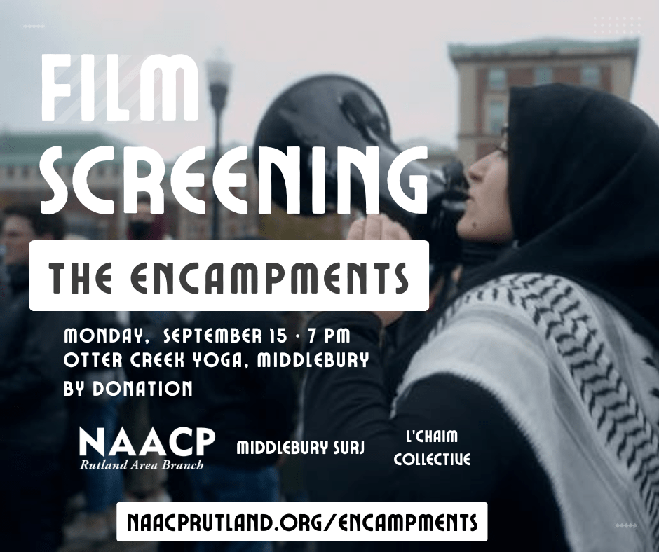 Join the Rutland Area NAACP, Middlebury SURJ, and L’Chaim Collective for a screening of The Encampments, a film about the student movement for Palestine. The film will be followed by a discussion with Wafic Faour of the organization Vermonters for Justice in Palestine. Refreshments will be available.